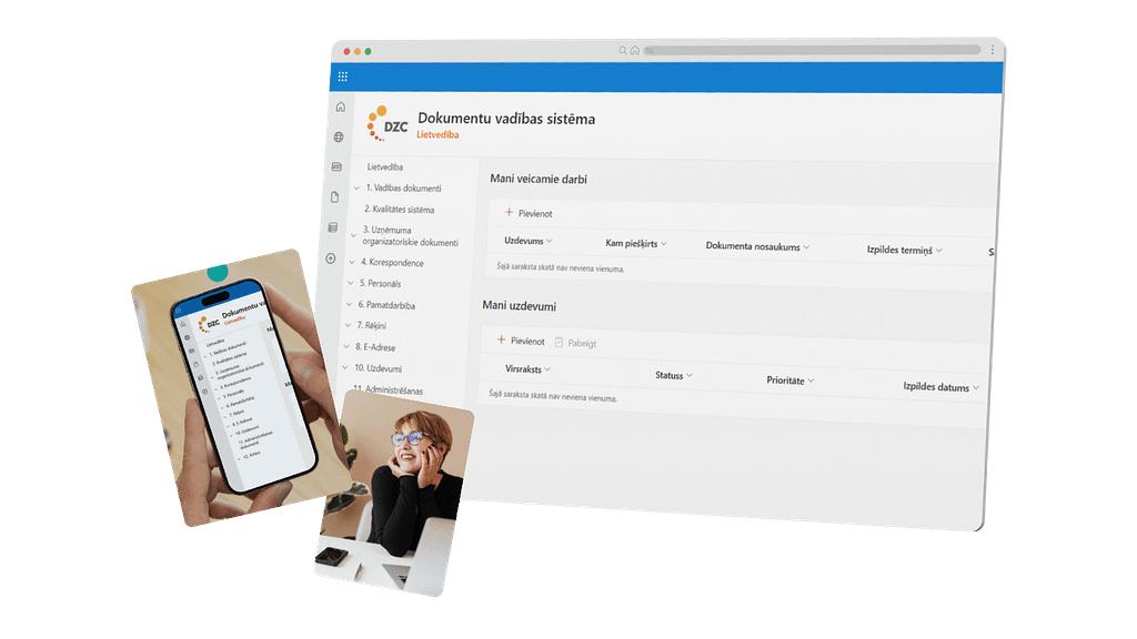 DVS nodrošina pilnu dokumenta dzīves ciklu un procesu caurredzamību reāllaikā. Sistēmas integrācija ar Microsoft 365 vidi un e-paraksta rīkiem garantē drošu datu apmaiņu un piekļuvi informācijai no jebkuras vietas.